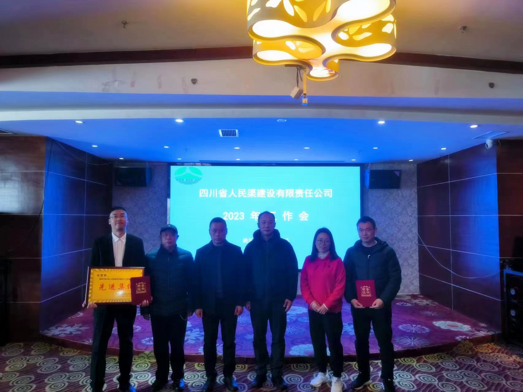2023年2月6日上午9点30分,四川省人民渠建设有限责任公司在绵阳紫海原香酒店召开2023年工作会,会议由董事长周勇主持,公司全体人员参会。