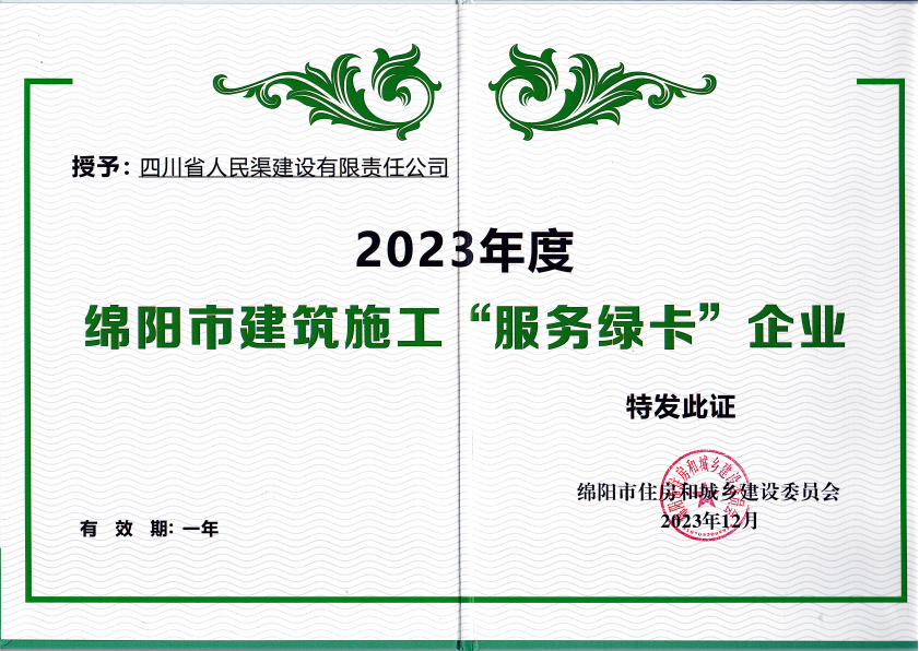 2023年,绵阳市住房和城乡建设委员会授予人民渠建设公司“2023年度建筑施工服务绿卡”企业称号(绵住建委函[2023]666号),这是公司全体员工克难攻坚、众志成城赢得的,也是上级单位无微不至的关心和社会各界鼎力相助的结果。下一步,人民渠建设公司将继续践行企业宗旨,提供优质服务,展现水利铁军形象,初心不改,追求卓越,与社会各界竭诚合作,共谋发展。